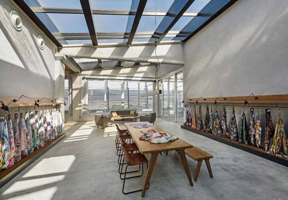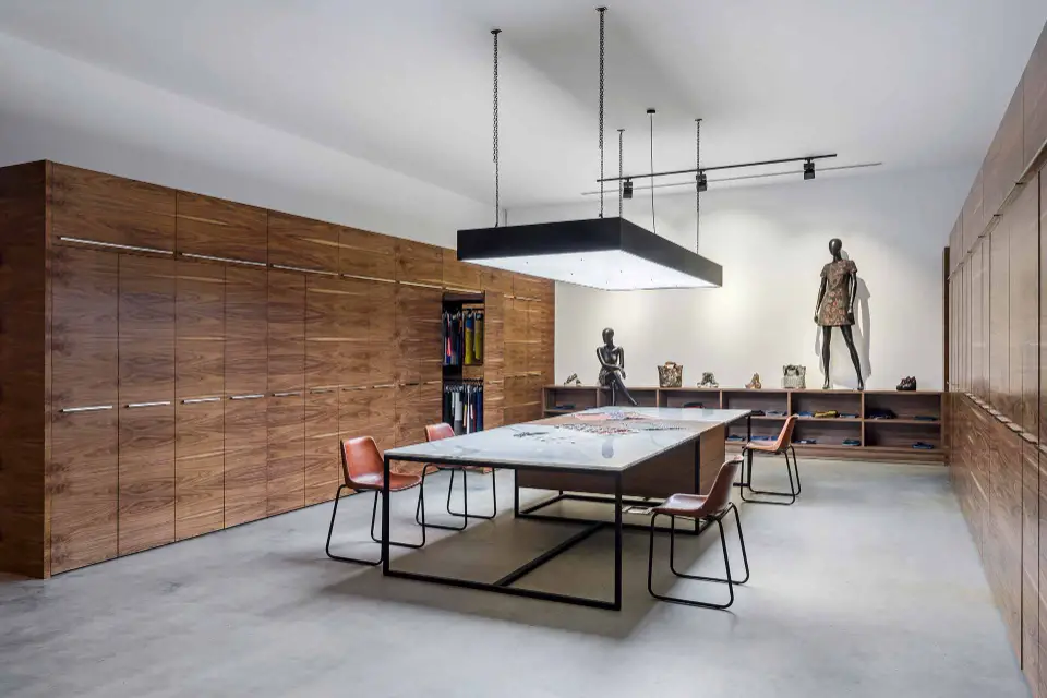 In the client showroom, a combination of fixtures was used to create a flexible and high-impact display area. A large, rectangular suspended light provides broad illumination over the main table, while our adjustable track lighting system allows for precise highlighting of textiles and products.