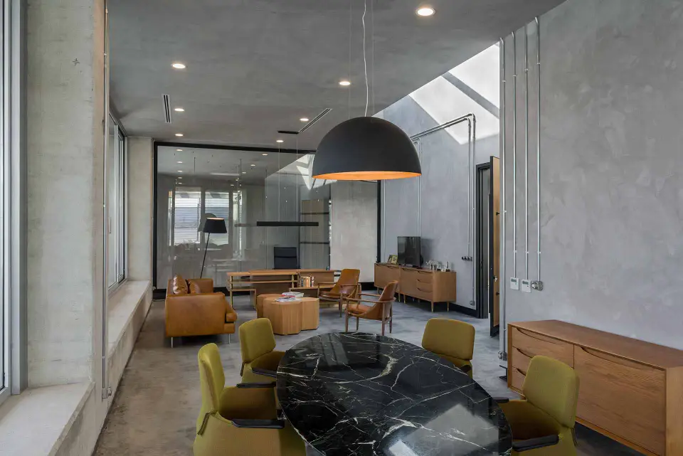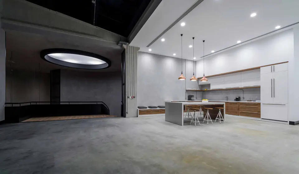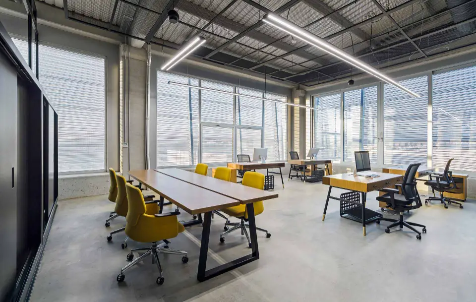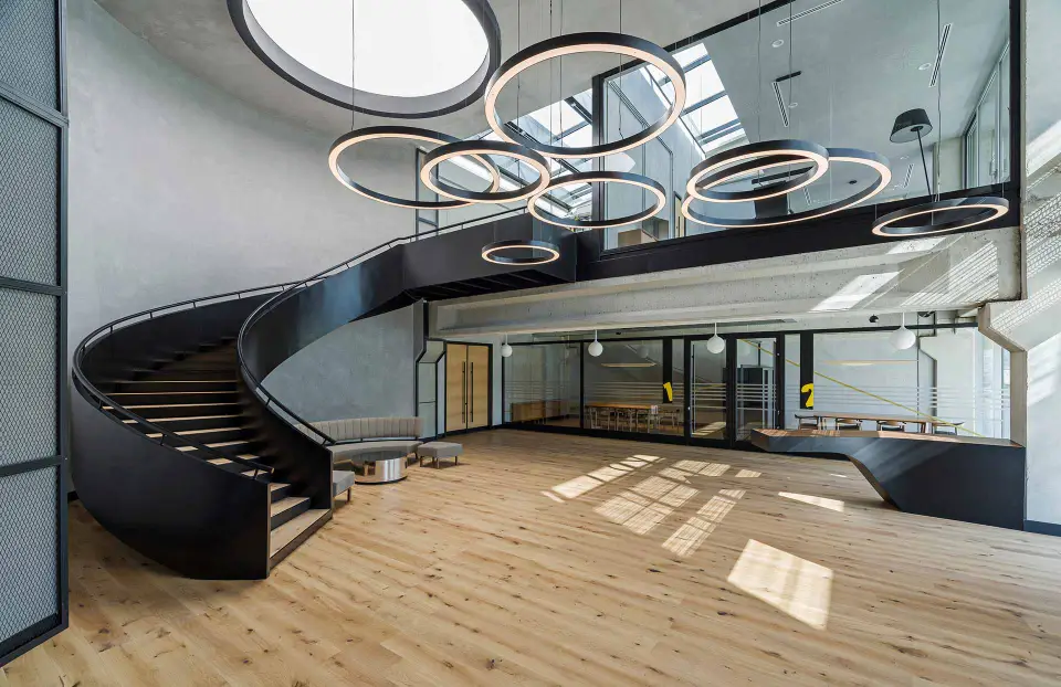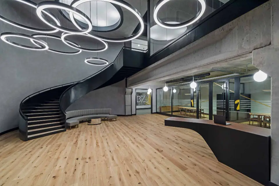 Throughout the open-plan offices and meeting rooms, our sleek, linear suspended fixtures provide optimal, glare-free task lighting. Their minimalist design integrates seamlessly with the exposed ceiling and industrial infrastructure, ensuring a focused and productive work environment.