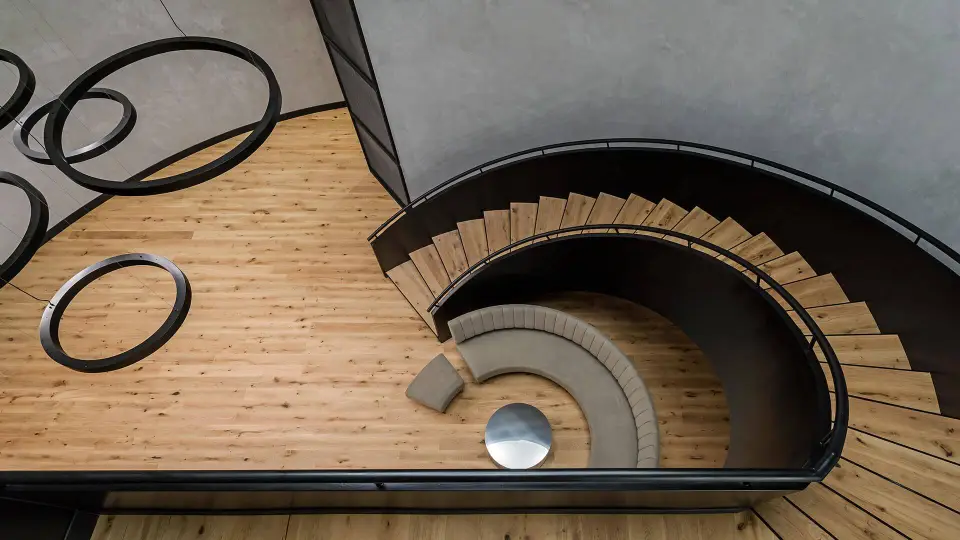 The heart of the lobby is defined by our custom-made, large-scale circular pendant lights. These suspended rings provide soft, ambient illumination and serve as a sculptural centerpiece, drawing the eye upwards and complementing the dramatic spiral staircase.